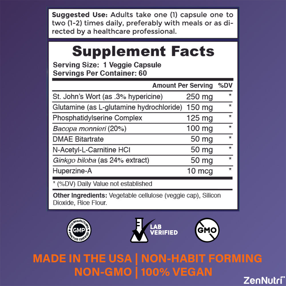 St. John’s Wort, Ginkgo Biloba, Bacopa monnieri, Huperzine-A, Glutamine (as L-glutamine hydrochloride), Phosphatidylserine Complex, DMAE Bitartrate, N-Acetyl-L-Carnitine HCl. Other ingredients: Vegetable cellulose (veggie cap), silicon dioxide.